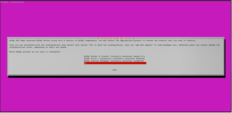 tools. The defaults will add the repository information for the latest stable version of MySQL and nothing else. This is what we want, so use the down arrow to navigate to the Ok menu option and hit